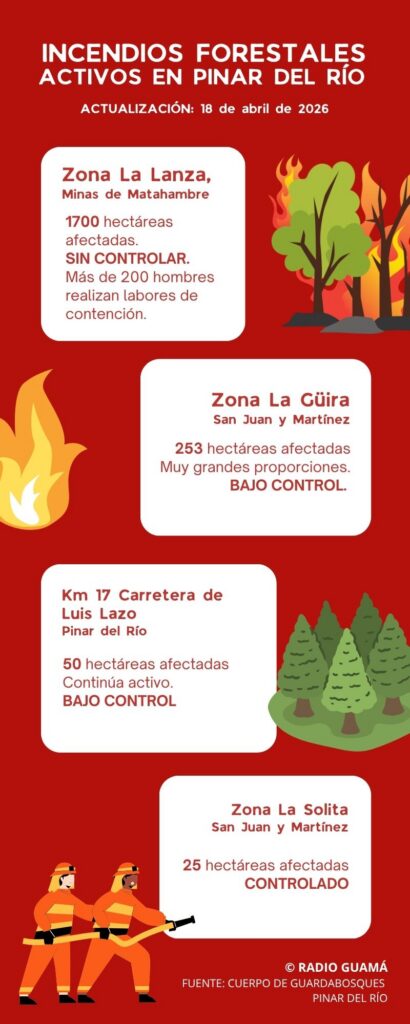 Con respecto a los otros incendios originados en la última semana, fueron reportados como extinguidos los de El Polvorín y La Vigía. En tanto, están bajo control el del kilómetro 17 de la carretera de Luis Lazo, en el municipio cabecera; el de La Güira, en el límite entre Pinar del Río y San Juan y Martínez; y el de La Solita, también en territorio sanjuanero.