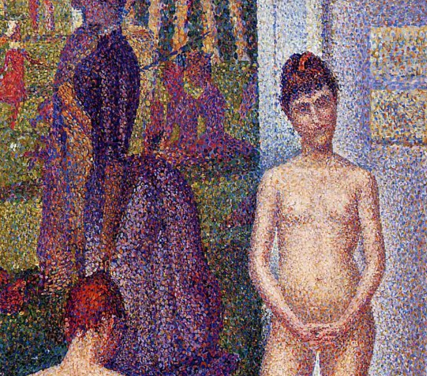 Observemos la siguiente pintura del artista francés Georges Pierre Seurat (1859-1891), una de las figuras más destacadas del neoimpresionismo. Si acercamos la imagen lograremos darnos cuenta de la forma tan peculiar en la que el artista logró dar profundidad al cuadro y resaltar el volumen de las tres figuras de la modelo.