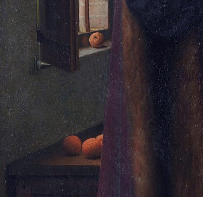 Las frutas en la repisa y cerca de la ventana indican abundancia y riqueza por ser de origen meridional, pero también han sido interpretadas como el fruto del pecado que el matrimonio elimina. Cierto o no, sigue formando parte del enigma que esta pintura representa, aun a día de hoy.