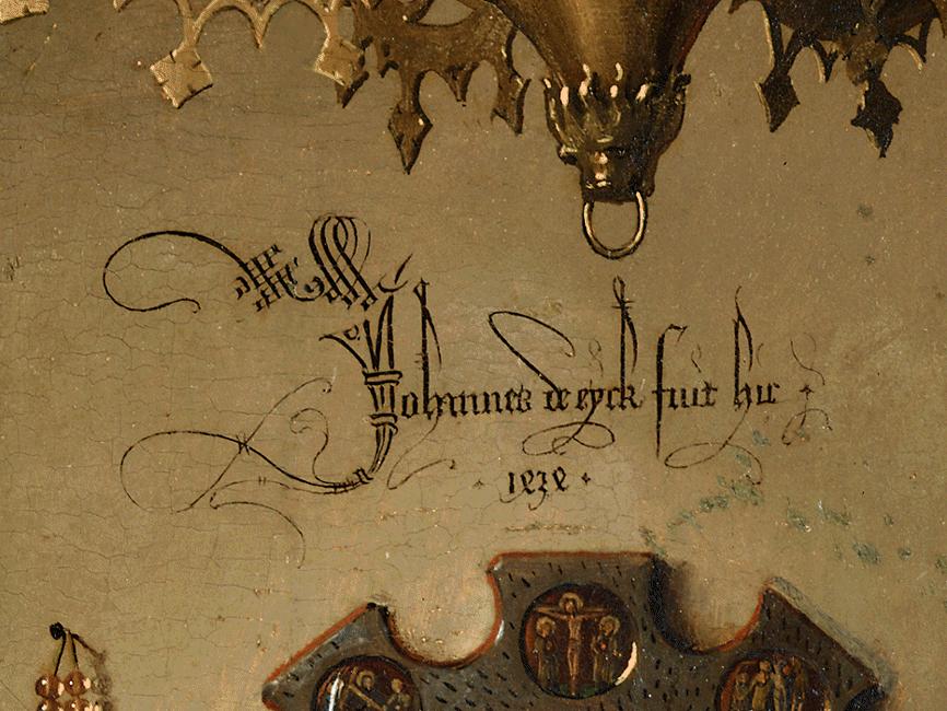 Por otro lado, la obra contiene elementos que actúan como índices, es decir, signos que mantienen una relación causal o existencial con su referente. En la pared del fondo, sobre el espejo, el artista dejó una inscripción que se traduce como: Jan Van Eyck estuvo aquí, 1434. Con ella dio cuenta de su presencia física en el momento y lugar de la “boda”, como un testigo del supuesto evento al que se refiere.