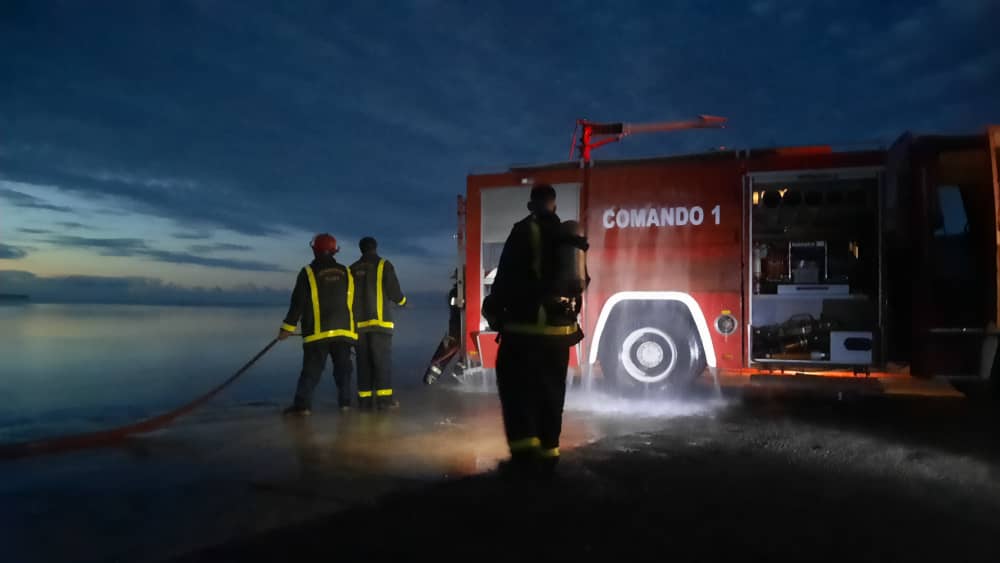 Fuerzas del Cuerpo de Bomberos en Pinar del Río trabajan en la extinción de un incendio, originado desde horas de la madrugada de este sábado en la Empresa Pesquera Industrial «La Coloma», una de las principales de su tipo en el país.