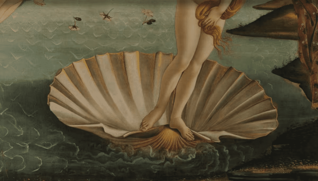 En la Galería Uffizi de Florencia se conserva uno de los cuadros más célebres de la historia del arte: El nacimiento de Venus. Pintado por Sandro Boticelli entre 1484 y 1486, esta obra al temple sobre lienzo que mide 278,5cm por 172,5 cm, representa a la diosa Venus emergiendo del mar sobre una concha , impulsada por dioses del viento, mientras una ninfa se acerca para cubrirla con un manto bordado de flores. El mar y la orilla se convierten en escenario de un mito que celebra la belleza y el nacimiento del amor.
