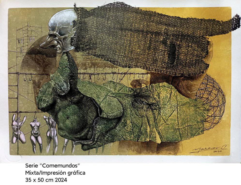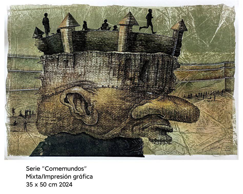 “Decido presentarme con un conjunto de tres obras: una de mayor formato y otras dos, de menor formato. Fueron realizadas entre los años 2024-2025, son piezas que forman parte de una serie que vengo trabajando desde 2023 que se titula Comemundos”, explicó.